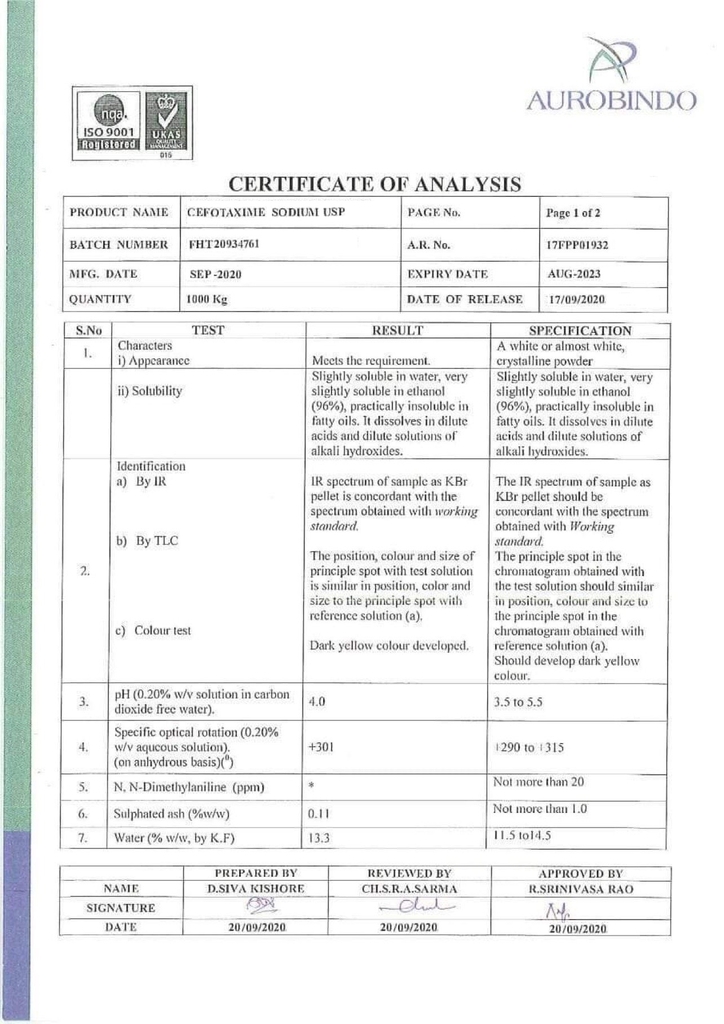 Cefotaxime Sodium là kháng sinh cephalosporin thế hệ thứ 3 có phổ tác dụng rộng, chủ yếu trên vi khuẩn Gram âm, đặc biệt hiệu quả với các chủng gây nhiễm khuẩn huyết, viêm ruột, viêm phổi và viêm màng não. Sản phẩm sản xuất bởi Aurobindo Pharma (Ấn Độ) – một trong những tập đoàn dược phẩm lớn nhất thế giới – đảm bảo chất lượng cao, tiêu chuẩn quốc tế, thích hợp làm nguyên liệu sản xuất thuốc tiêm trong thú y và thủy sản.